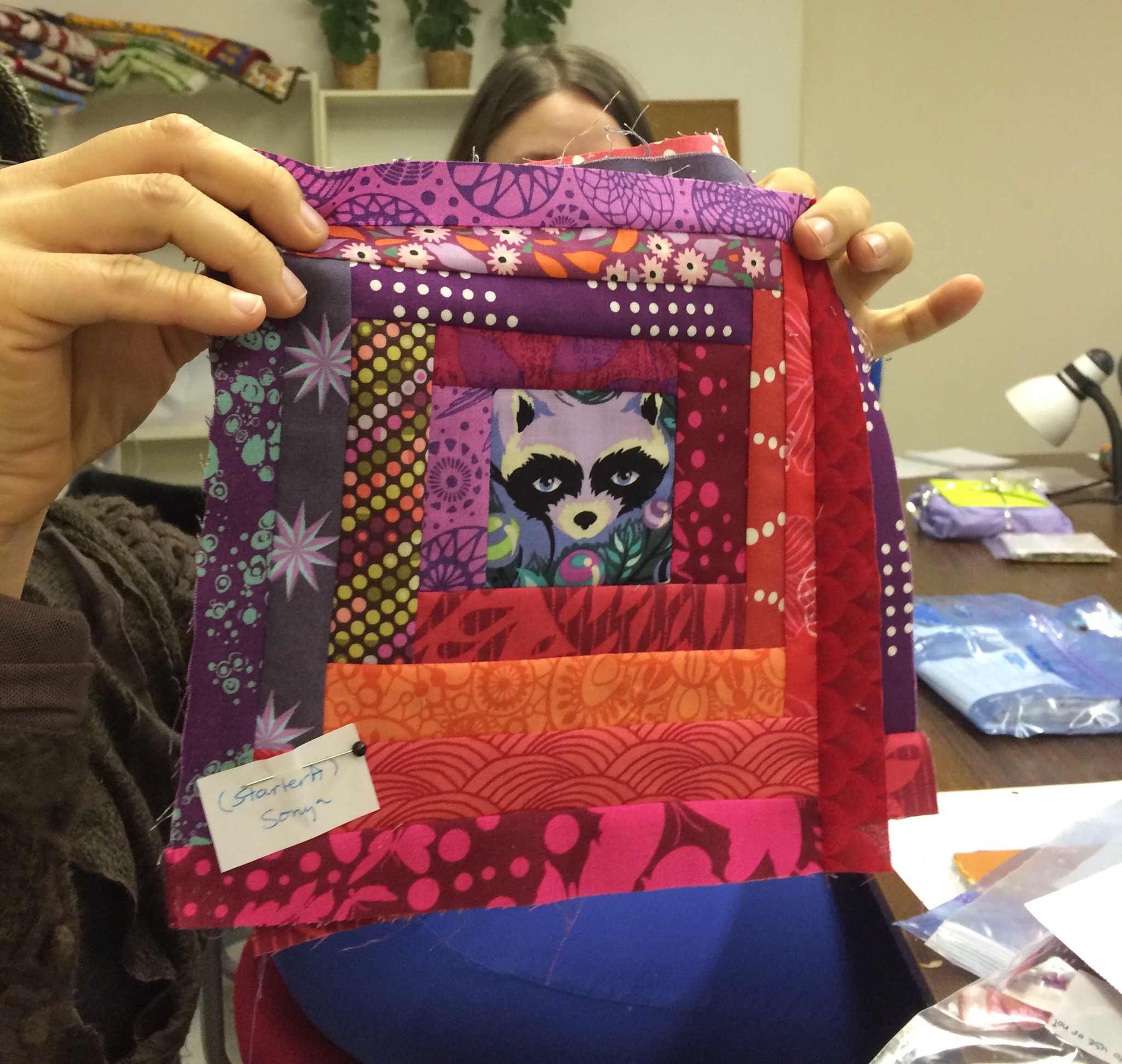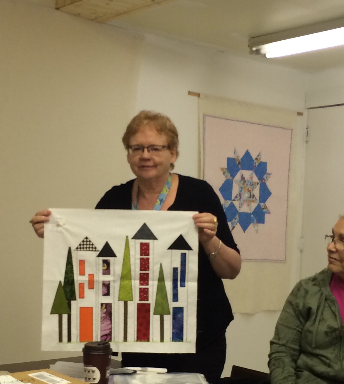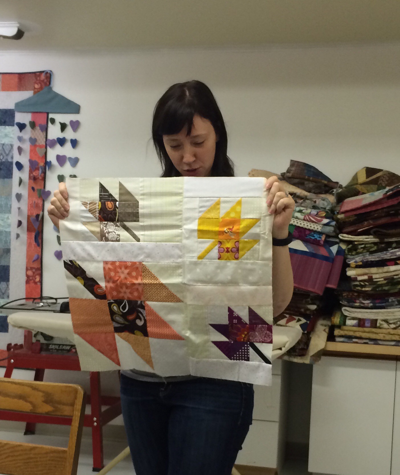 There are 37 photos to come from our September meeting, so based on how many words they’re worth, I’ll keep the actual words to a minimum. We had a very busy meeting in September! We wasted no time and jumped off by showcasing our travelling quilt starting blocks. There are 11 members participating in this exercise, and these are the initial blocks: