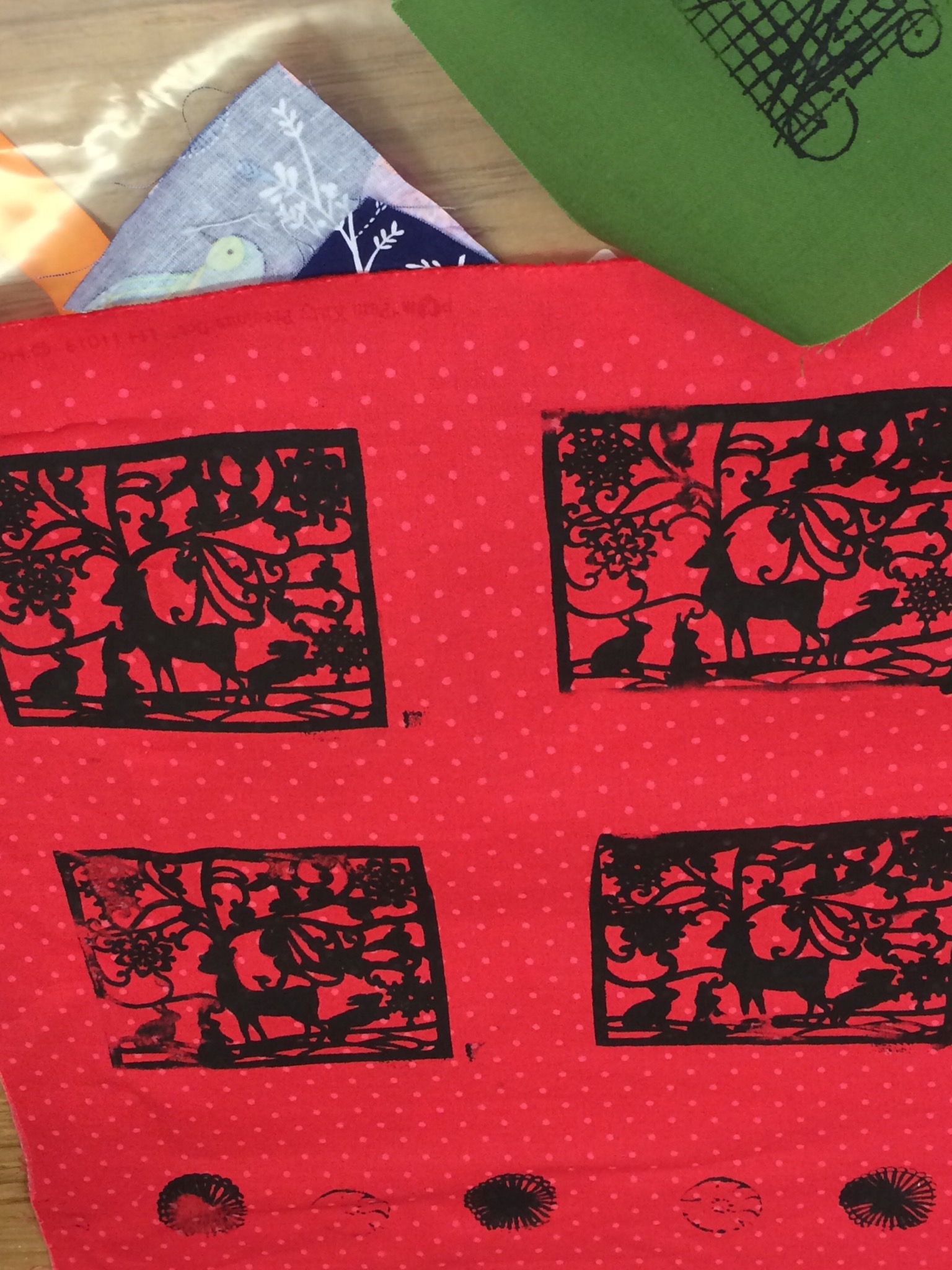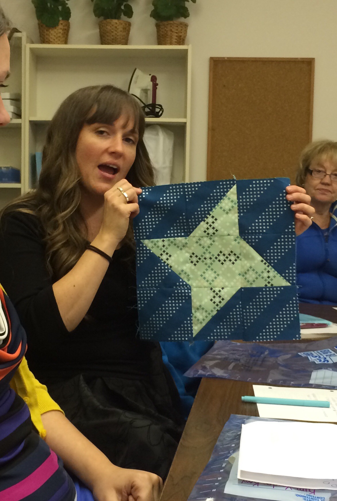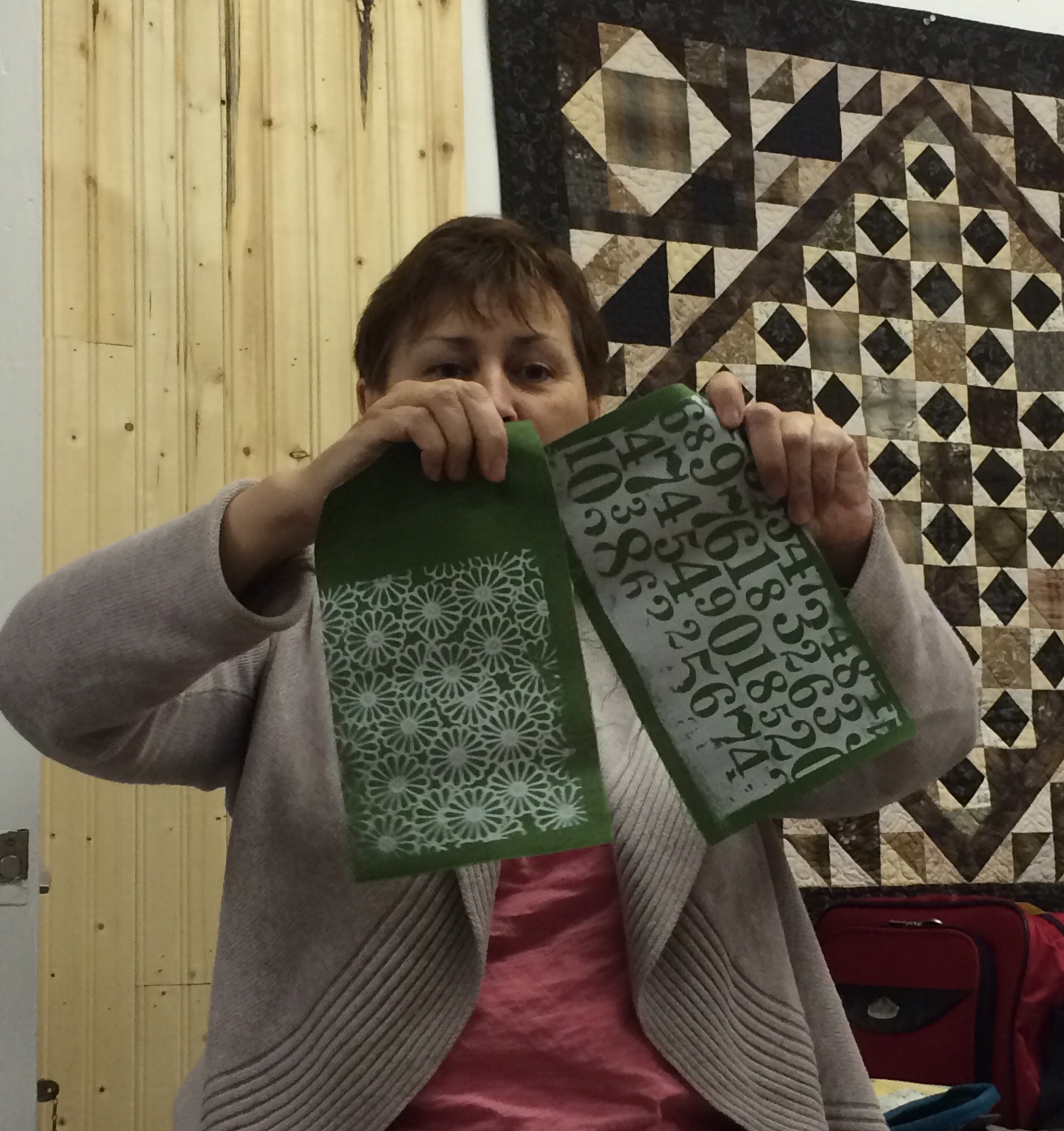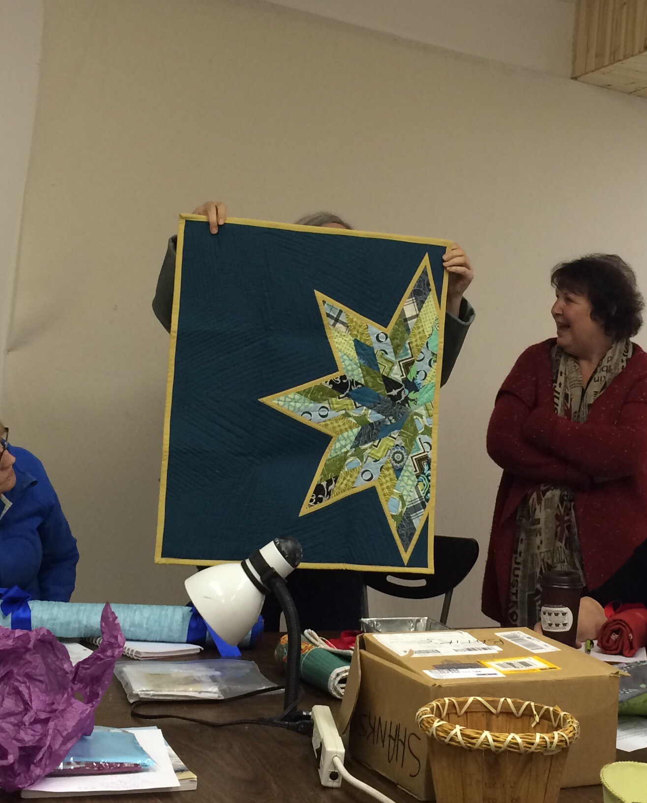 There are 37 photos to come from our September meeting, so based on how many words they’re worth, I’ll keep the actual words to a minimum. We had a very busy meeting in September! We wasted no time and jumped off by showcasing our travelling quilt starting blocks. There are 11 members participating in this exercise, and these are the initial blocks: