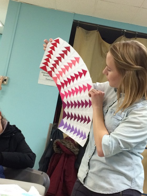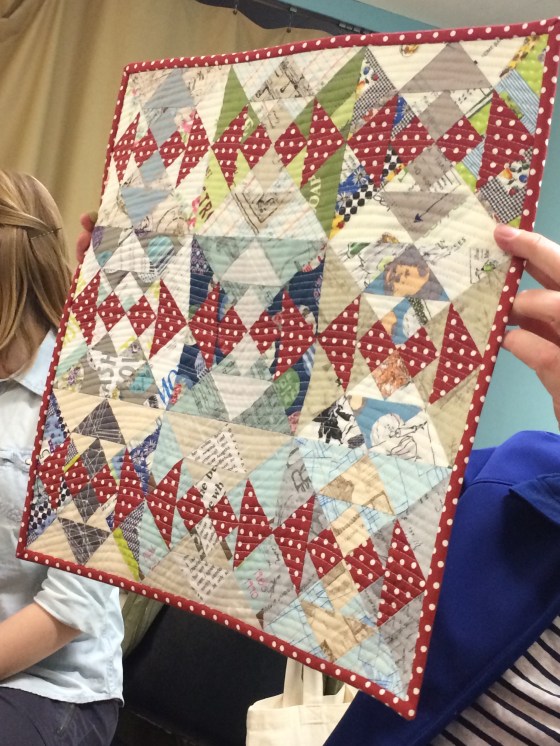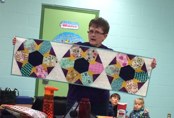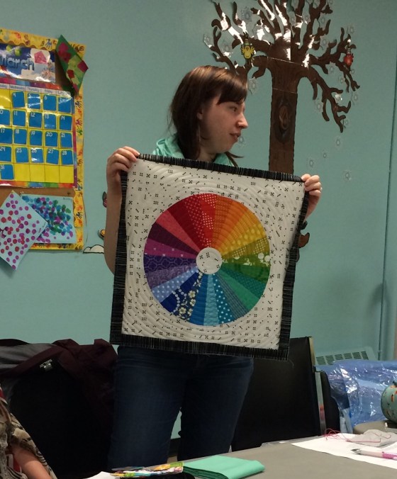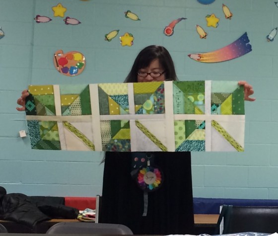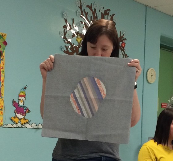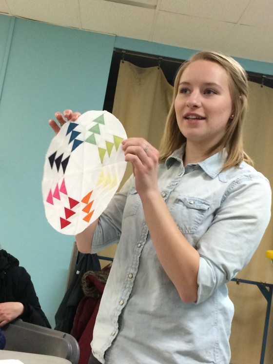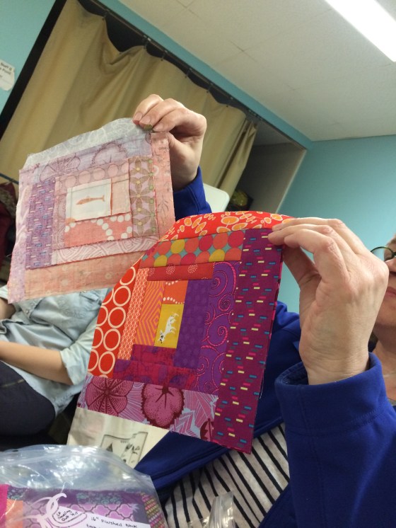 We kicked off our meeting by sharing the progress on the travelling quilts. Jaclyn created this improv pebble to add to Carly’s “pebbles on the beach” quilt.