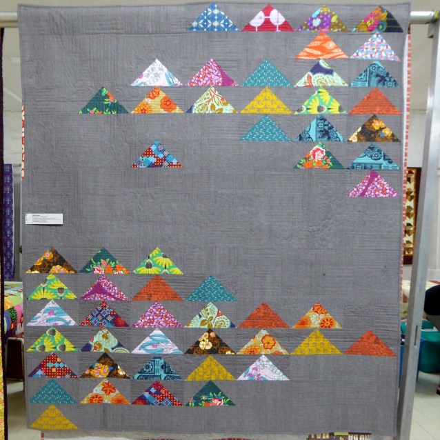 A coupe of Lisa’s many beauties. The first one is a Modern Alphabet using Tula Pink fabrics and the 2nd is flying geese made with Anna Maria Horner fabrics with lots of negative space for her to practice her longarm quilting techniques on.