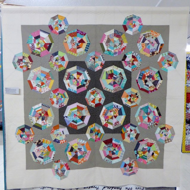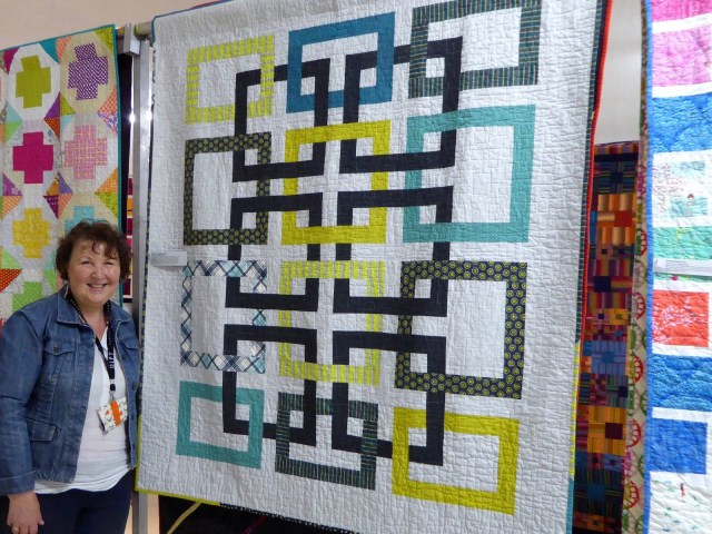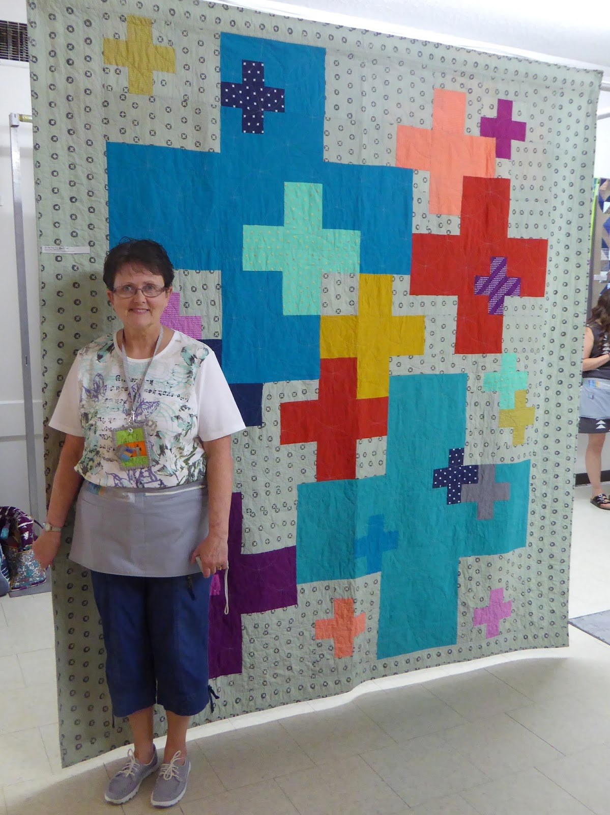 Patti with her giant plus quilt and and her half-square-rectangle quilt. She had several beautiful minis on display, too. Watch for the beautiful paper-pieced lion at the bottom of this blog post. To see more of Patti’s work, including beautiful bags, check out her blog at Retired to Quilt.