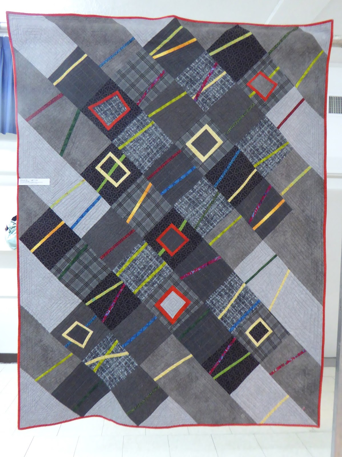 Carly, the master of improv, had several quilts in the show. Do you recognize the representation of Star Trek uniforms in the 3rd one? The 4th one below is a Punisher quilt made especially for a brother-in-law. And below that is Carly’s take on the spider web quilt, including a little spider stitched into the quilt. See more of Carly’s quilts and check out some of her excellent tutorials at her blog, Citric Sugar.