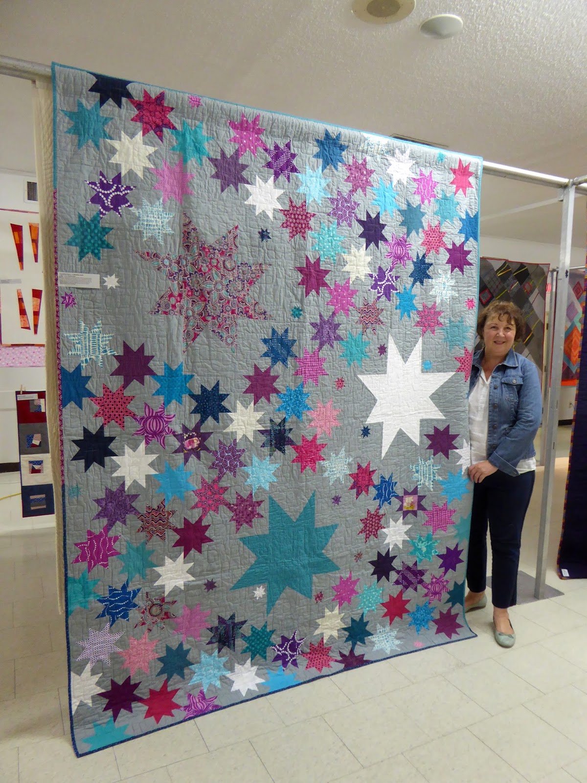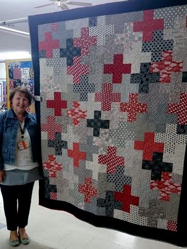 Sheila with 3 of her quilts. You can see more of her quilts at her blog, Stitched by Sheila.