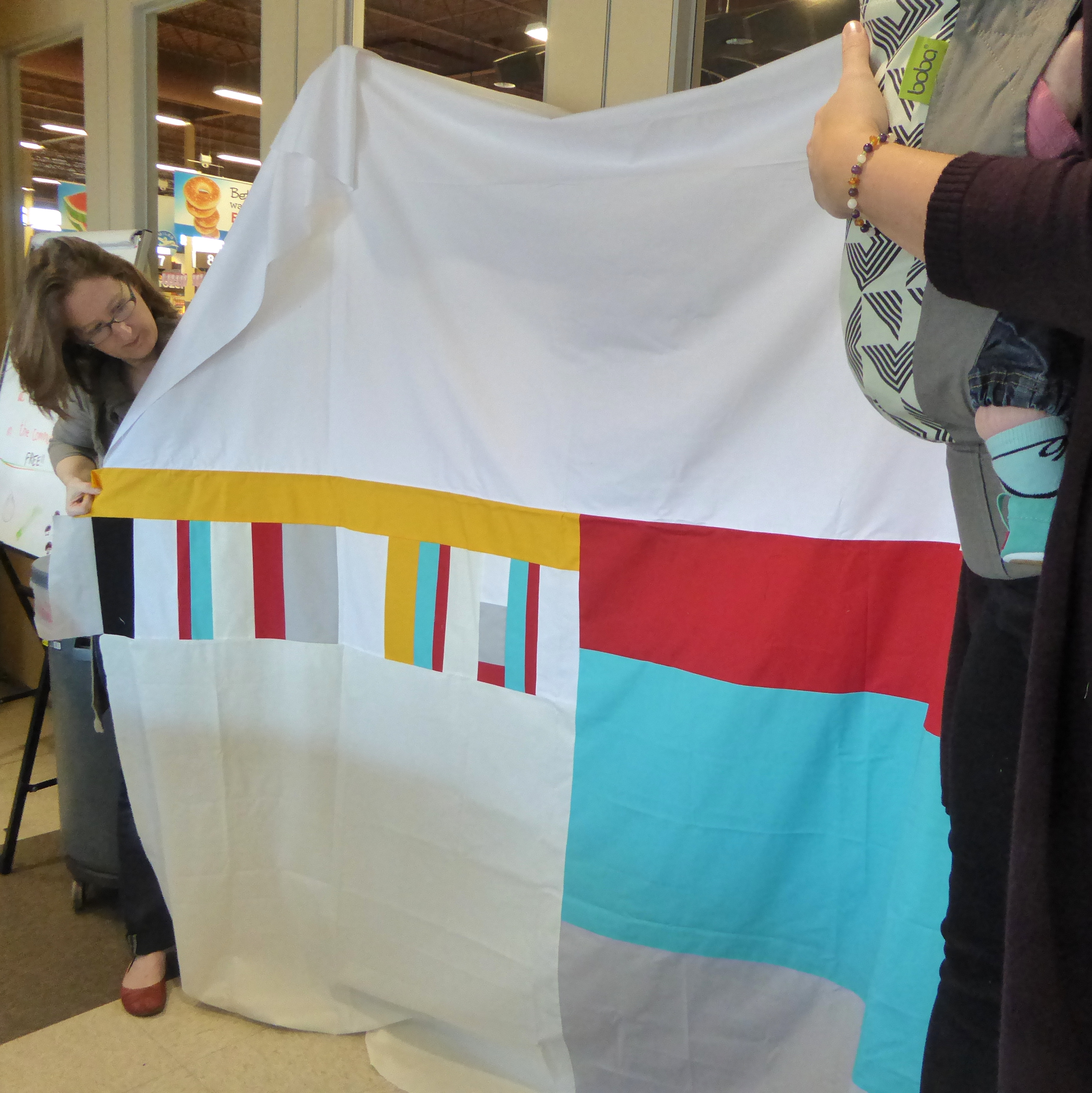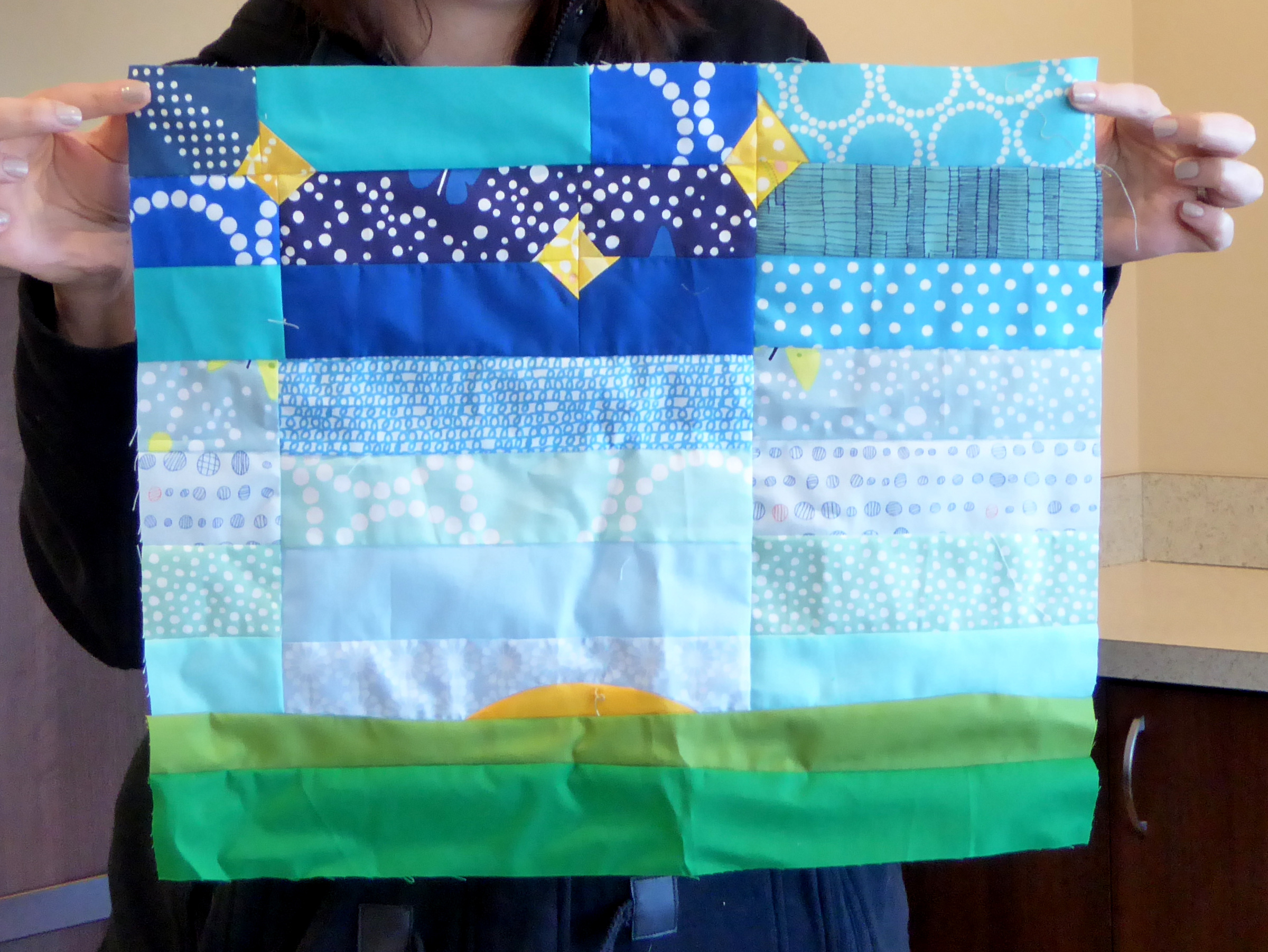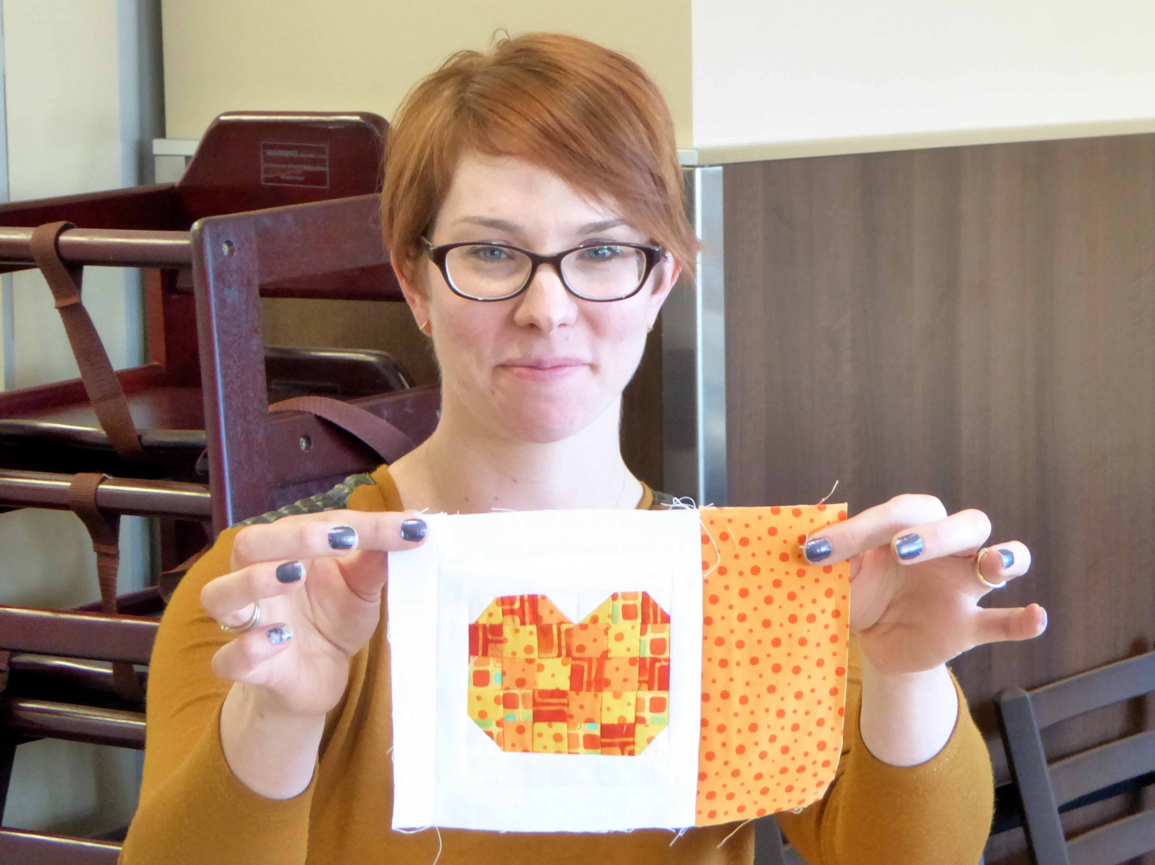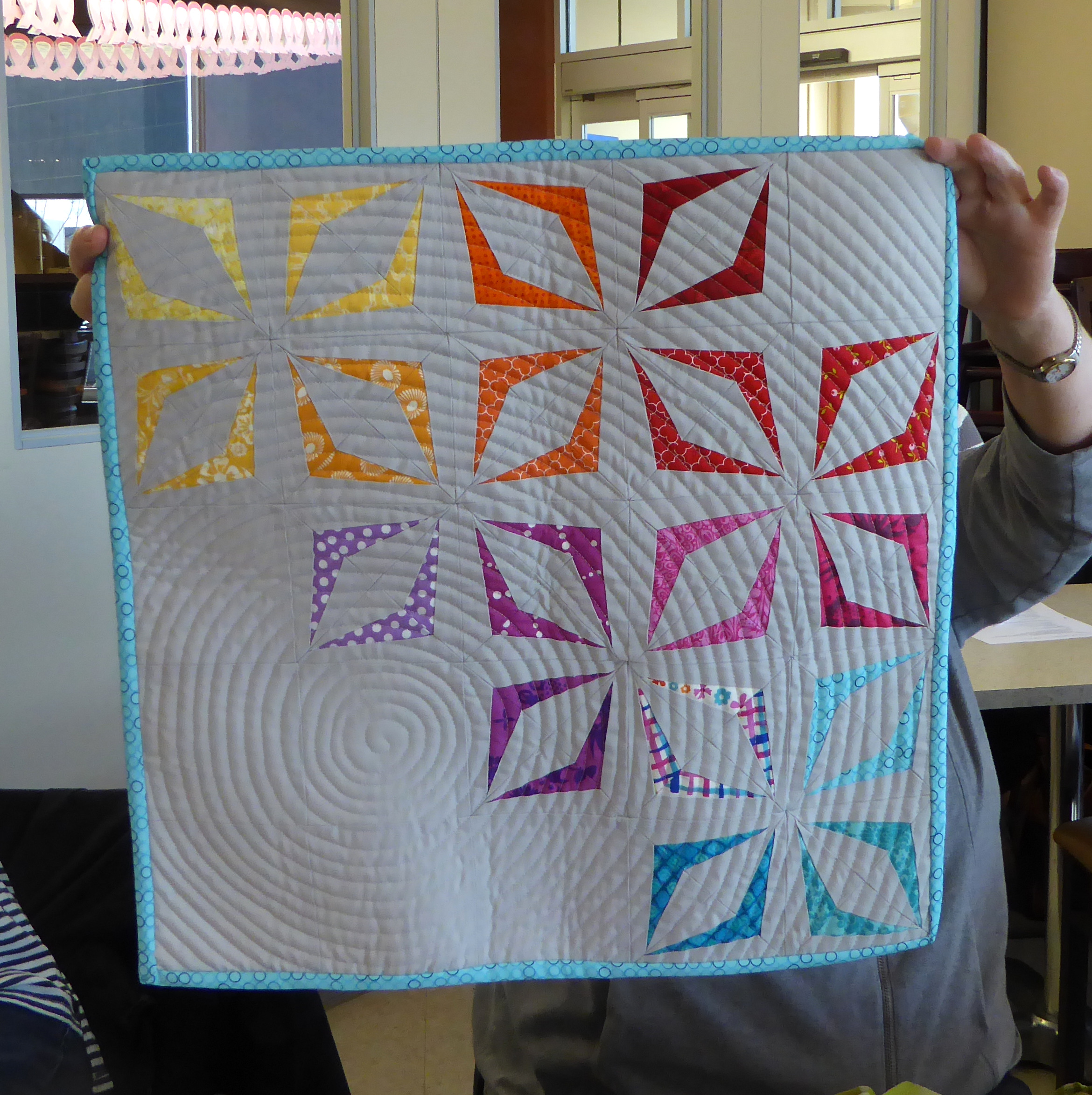 Carly took all of the contributed “jawbreakers” and put them together. Thanks, Carly! Next it’s to quilters and binders so that it will be ready to send to QuiltCon as a charity quilt.