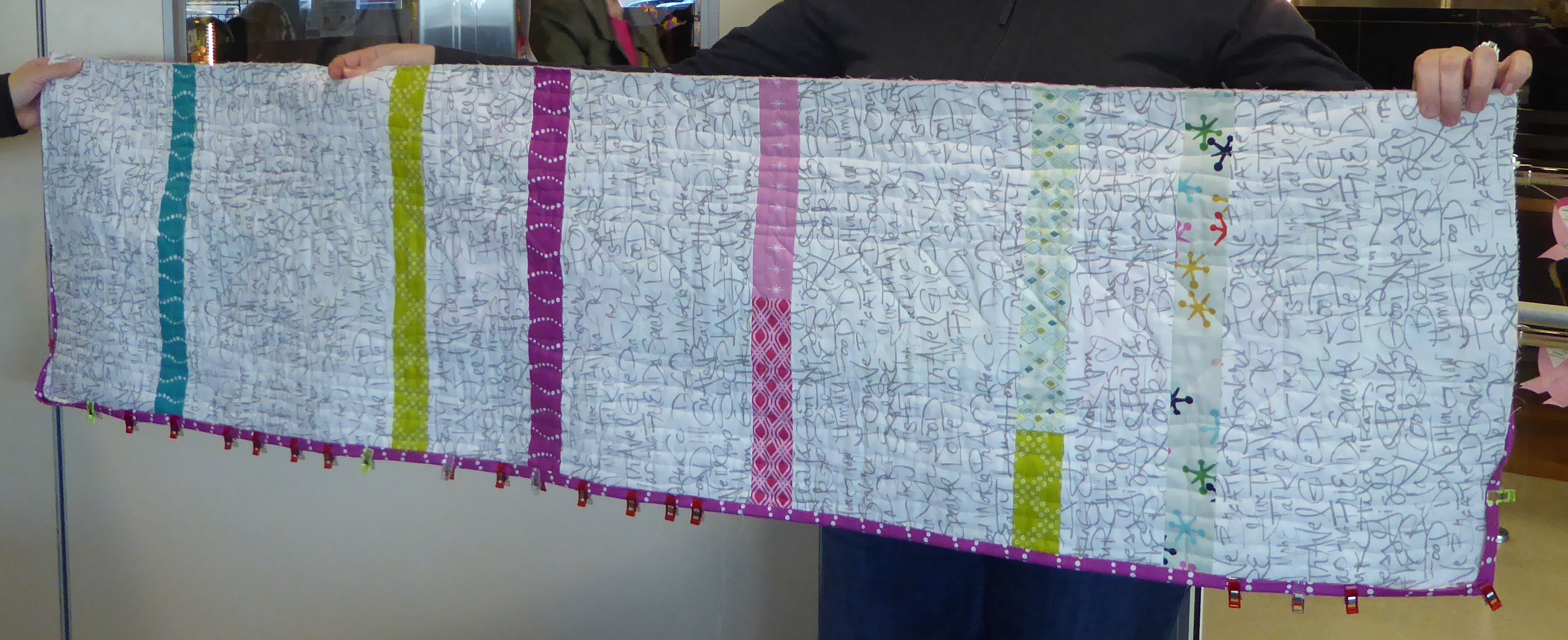 Darla used the “friendship bracelet” pattern to make this pretty, reversible table runner. She was busy binding it at the meeting.