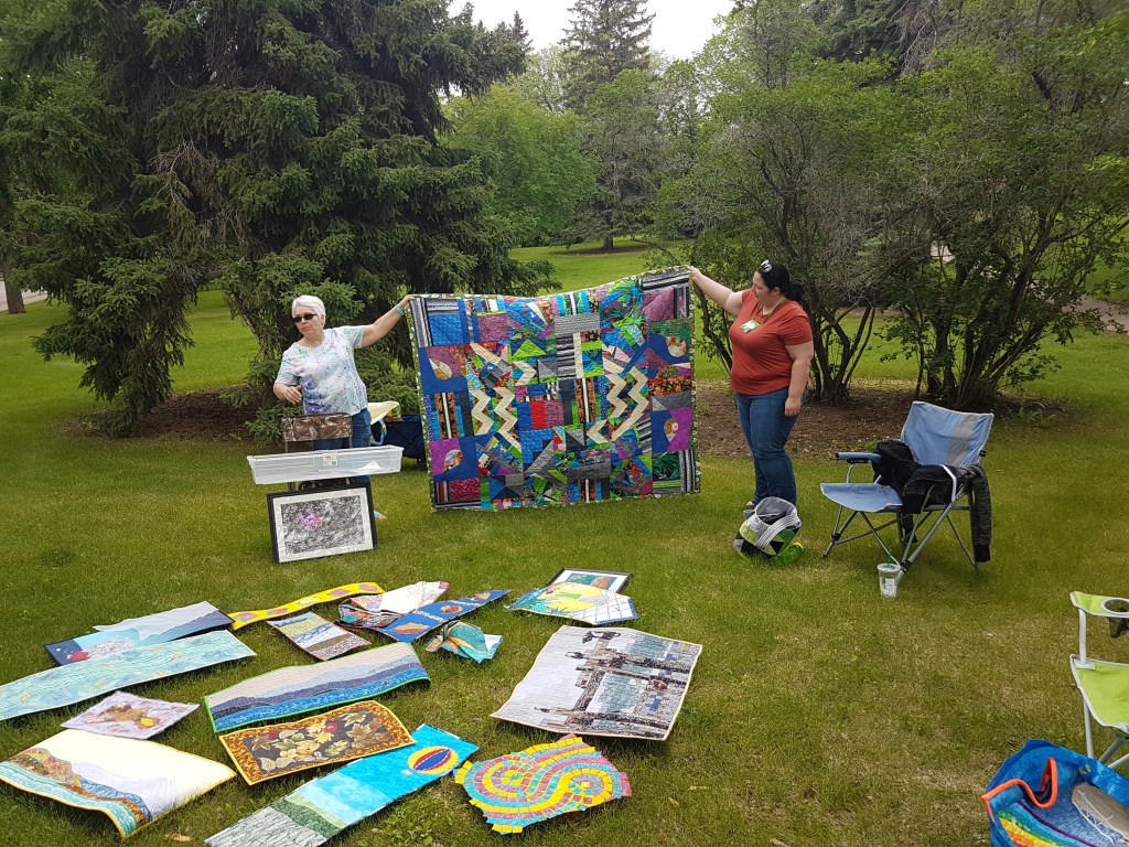 We hosted our second meeting in Beuna Vista Park on June 28th and it was absolutely lovely. We will continue in the park in July and August because the location really can’t be beat. Dyanne led the educational portion of the meeting with a talk on art quilting. She always says she isn’t a quilter but her work says otherwise. It is absolutely gorgeous! She is so artistic and talented and it was a true treat to hear the inspiration behind her pieces. This photo captures a glimpse of the setting and Dyanne (left) and our Chair Charlene (right).