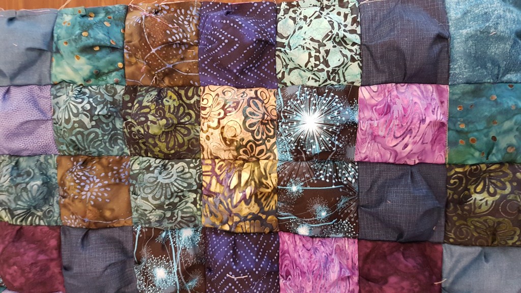 It has been fun to have so many new members joining us as this brings so much inspiration. We hope Shari brings this finished puffy quilt next month as it is such a cool technique that was new to all of us. Here is a sneak peak. The full-size quilt is going to be stunning and snuggly.