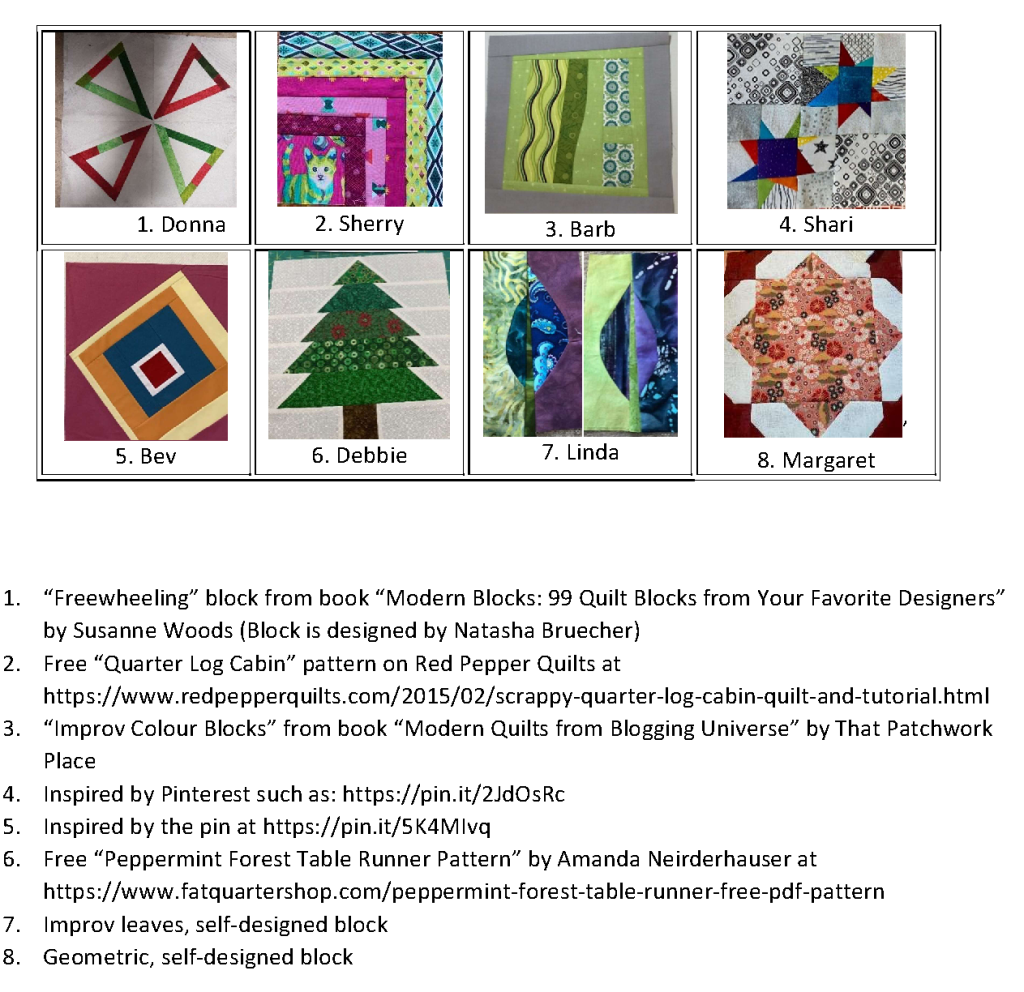 Our virtual sew day was super fun because we introduced our 2021 traveling quilt blocks. Those participating have one month to make block(s) to contribute to the quilt in their possession. Then the projects keep travelling. If we want these quilts for Christmas, we will have a couple of months to finish them as the rotation will stop in September. Eight of us are participating and here is some eye candy to prove it. Our inspiration is also provided. Of course anyone not in the rotation is welcome to add blocks if they want a challenge too.