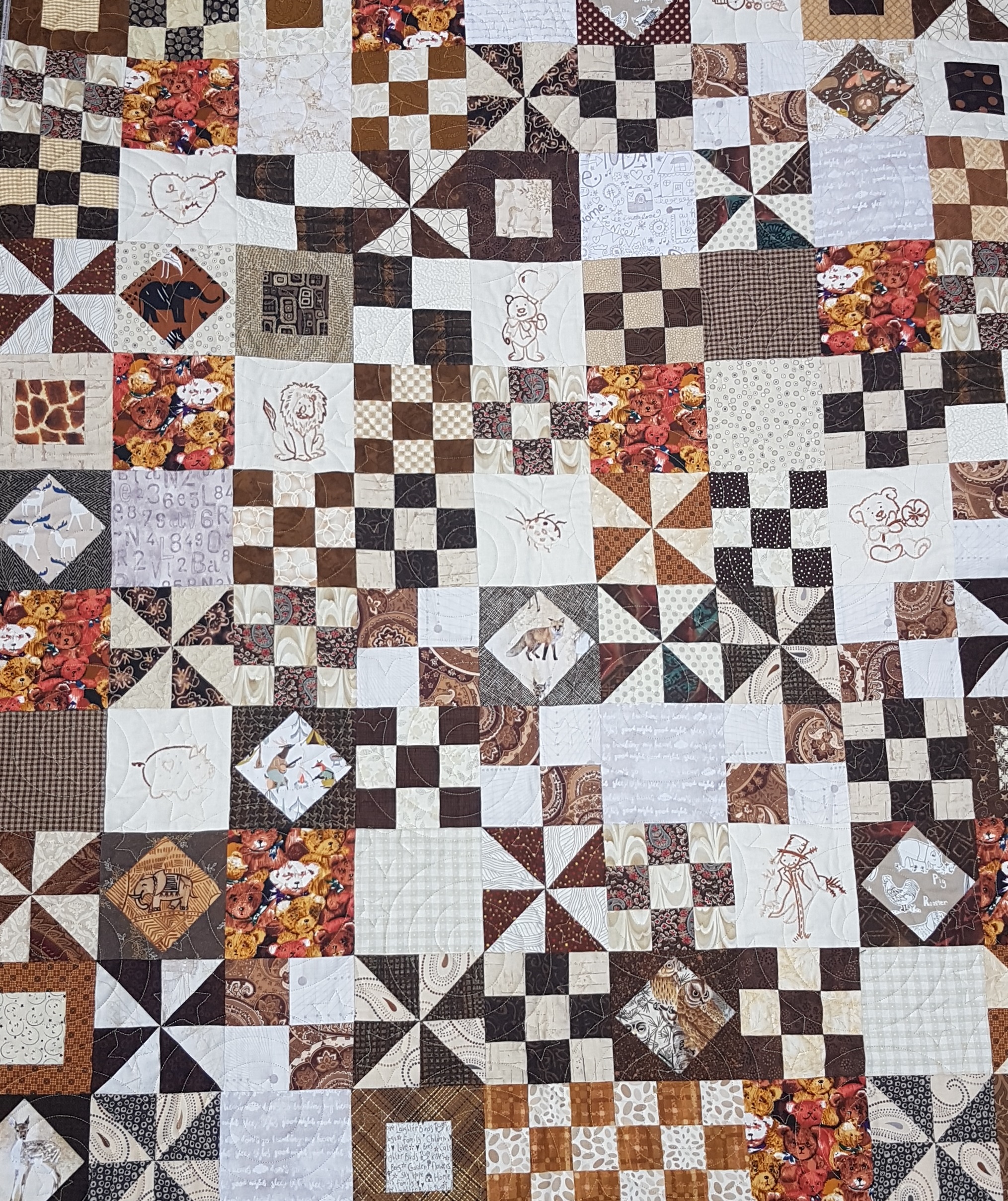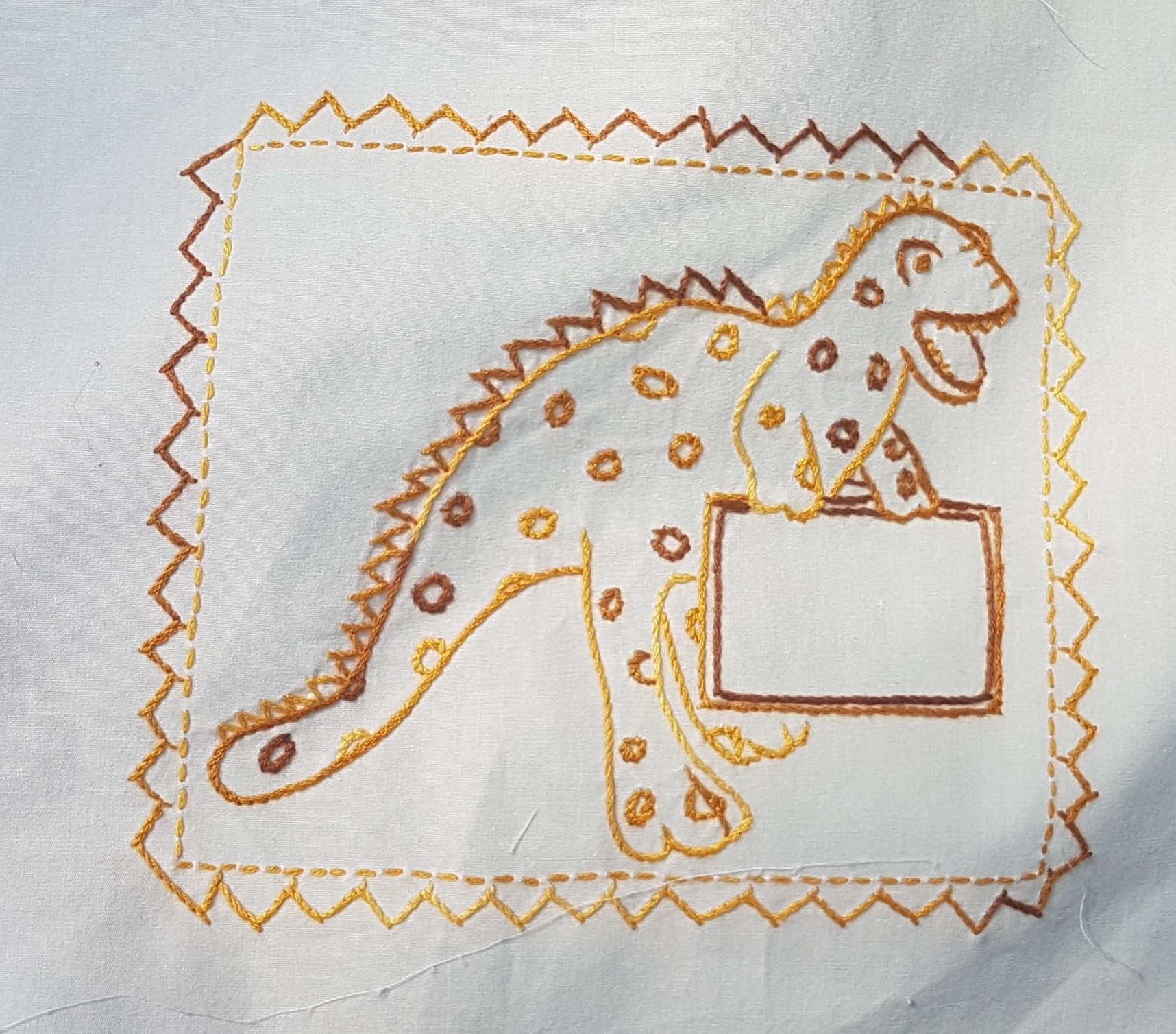 And to end out the meeting, Deb showed us tons of embroidered projects and even brought the supplies so we could try out embroidery. Check out the embroidered animals made from brown variegated thread in the quilt below. Inspiration can come from colouring books, purchased patterns, or free embroidery patterns online such as the Holiday Stitch-a-Long with Moda (embroidery design below by Susan Ache). And there are books like Elegant Stitches by Judith Baker Montano that can help teach the different stictches. Deb’s labels are so cute. The dinosaur is just waiting for some text. And our other fantastic stitcher Nancy phoned around and found places to buy thread in Saskatoon including Prairie Lily Knitting and Michaels, and of course, it is worth a visit to one of our local quilt stores to check what threads they carry.