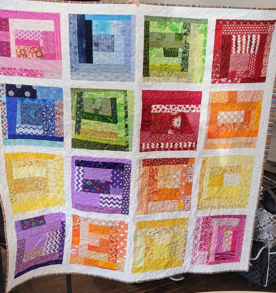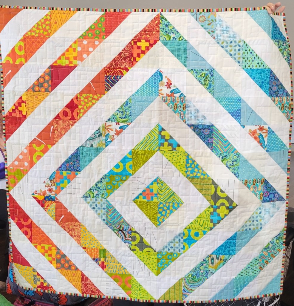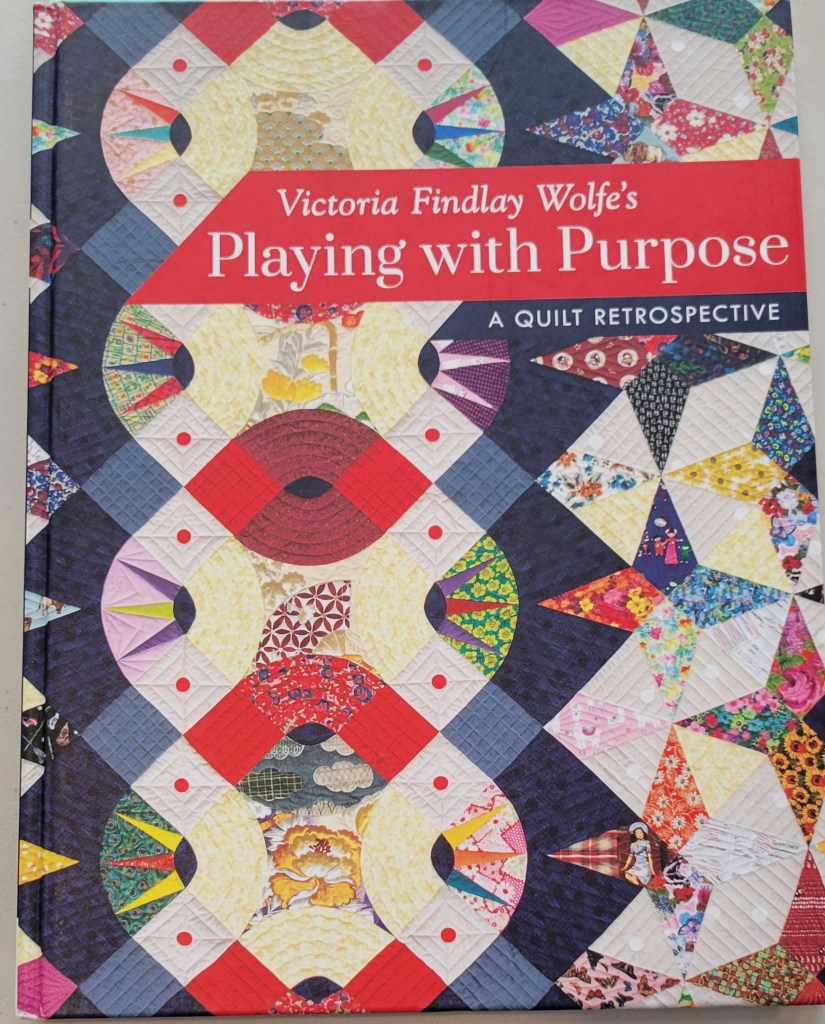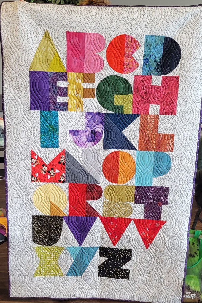 We saw several traveling quilt blocks. Margaret’s shown below (top left) is Village Square. Also shown are couple of HST quilts, and a book by Victoria Findlay Wolfe. The two bottom right quilts show examples of stash projects. The alphabet is the Letra quilt pattern.