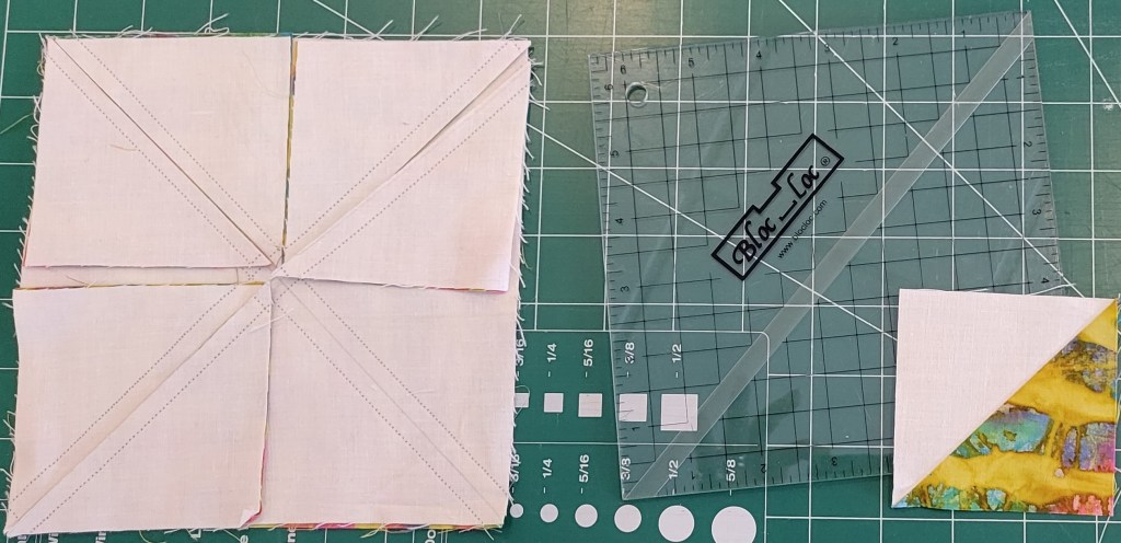 The Saskatoon MQG met on February 26th for a sew day at Home Inn & Suites. Linda S-K showed us how to make half-square triangle (HST) units based on the “8 at a Time Half-Square Triangle Units” download at: https://studylib.net/doc/18219288/8-at-a-time-half-square-triangle-units. This handy chart shows the square size to cut for a range of HST sizes. The coolest thing for me was to see that you can flip the HST using the Bloc Loc ruler when trimming because the groove on the ruler holds the block in place. Here is a YouTube video that explains this: https://www.youtube.com/watch?v=UMxnXkFENxo.