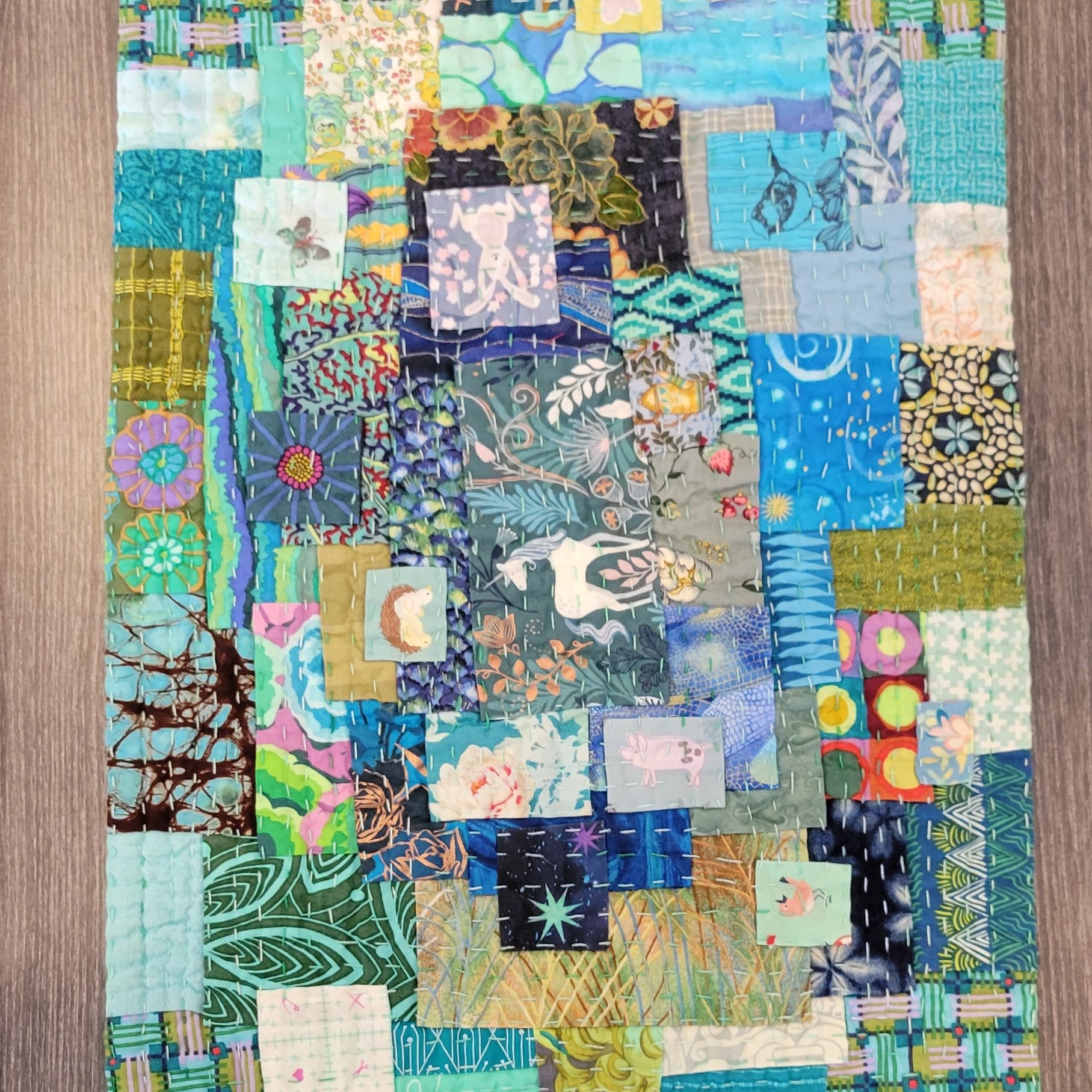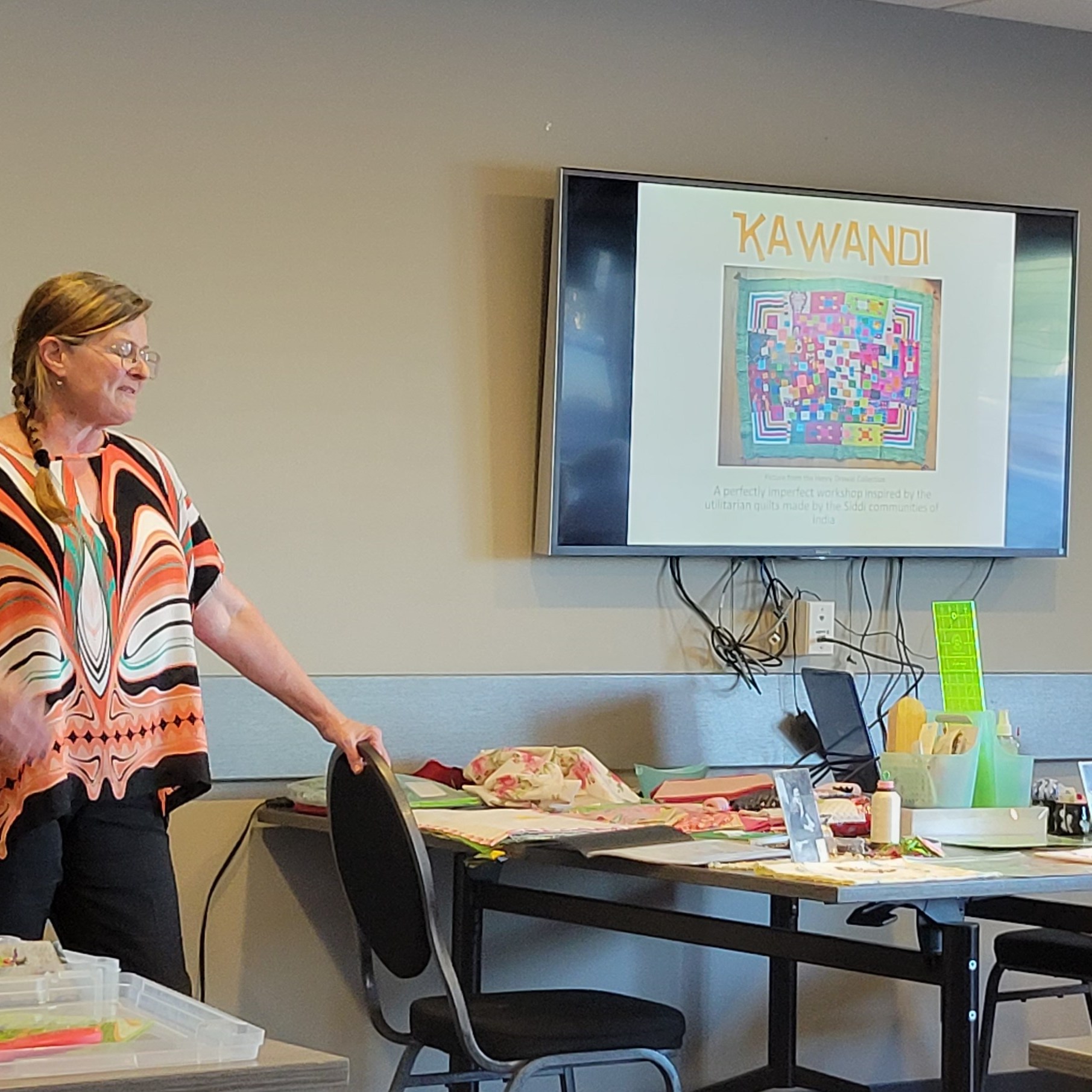 The Saskatoon MQG met on June 4 for a sew day at Home Inn & Suites in Stonebridge. This was a special day because Roxanne provided a Kawandi Workshop. It was all about stitching in stories. Roxanne prepared us by saying “let whatever you do today be enough”. We learned that these are utilitarian quilts made with found and gathered scraps by Africans (Siddis) in India. Fifteen of us managed to learn about Fula, the Pillars, Tikli, the Belly, and that batting has a right and wrong side (show the dimples, hide the pimples). Now to everyone participating, PLEASE try to have these completed by the quilt show planned for August!!! Thank you so much Roxanne for this amazing experience. It was so lovely to learn more about you too. We are all set for hand sewing at the lake now.