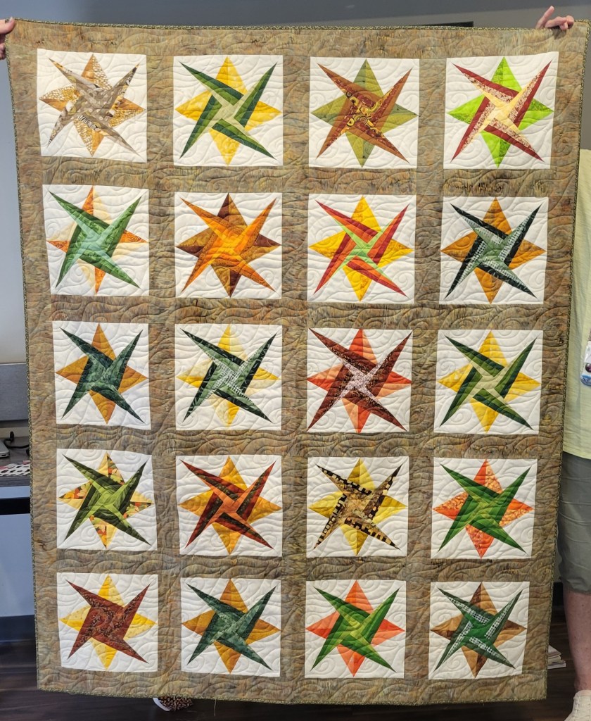 We met at Home Inn and Suites on May 25, 2025 for a sew day. We had the pleasure of hosting a virtual trunk show with Chris Jurd of Patchwork Fun from Australia. What a treat to view four decades of her incredible quilting work! Chris is the author of Big, Bold & Beautiful, although the book is currently out of print. However, you can still explore her unique patterns on her Etsy shop: http://www.PatchworkFun.etsy.com. You can also follow her quilting journey on social media including Facebook: Chris Jurd and Instagram: @patchworkfun. Her email is: chris.jurd@bigpond.com.