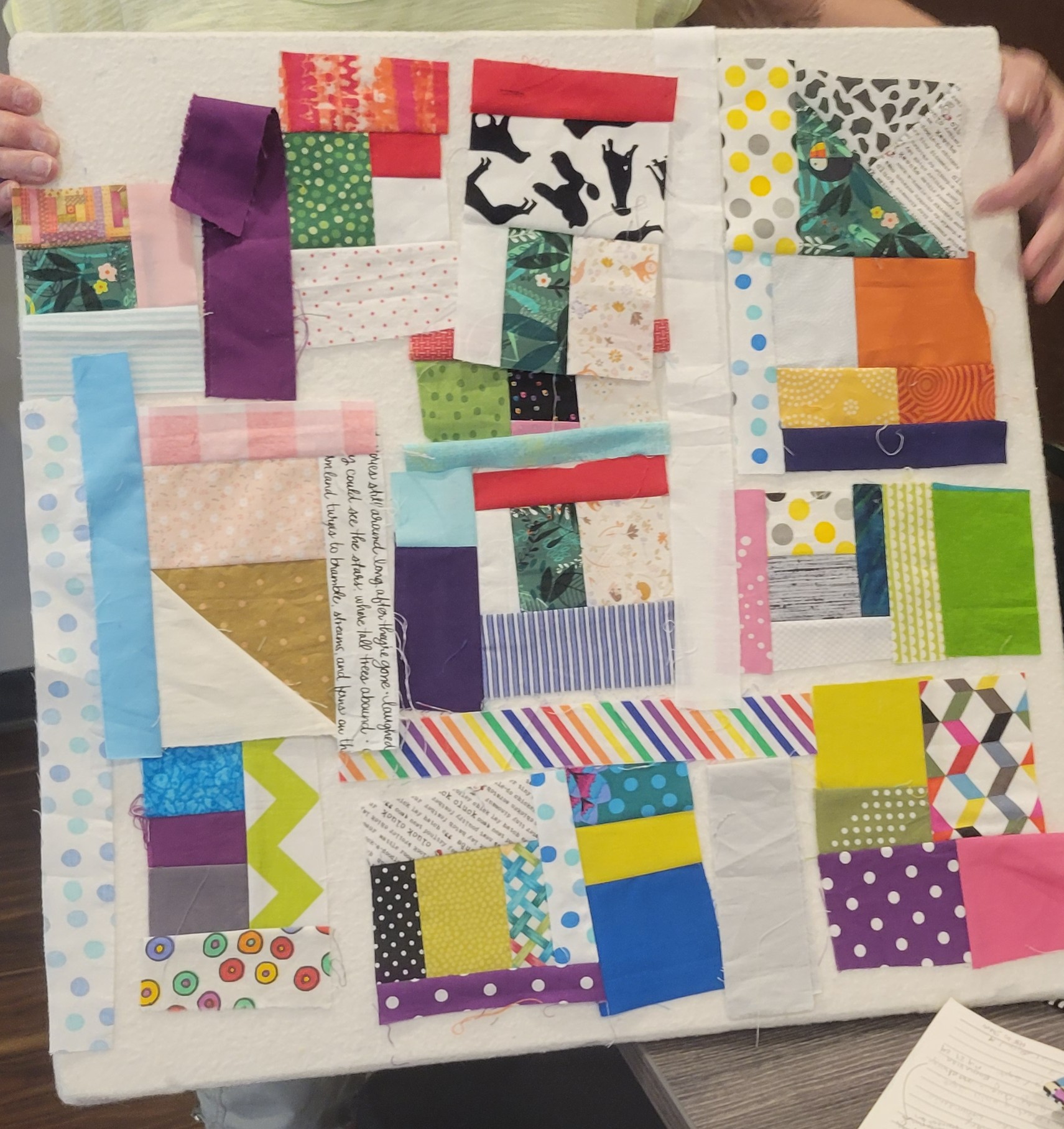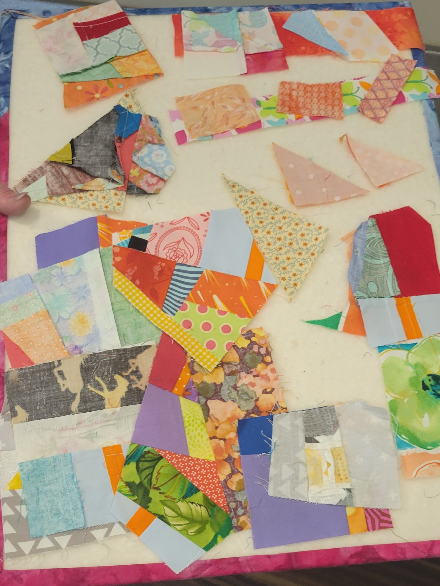 Now, back to our crumb quilt project! Everyone is encouraged to create 10.5” (minimum) square crumb blocks for our September meeting. These blocks will be used in our next charity quilt. Be sure to trim all seams to 1/4 inch, to press all seams carefully, and to use a short stitch length to secure tiny pieces (thanks to Roxanne and Laura for the inspiration boards!). Make as many blocks as you’d like!