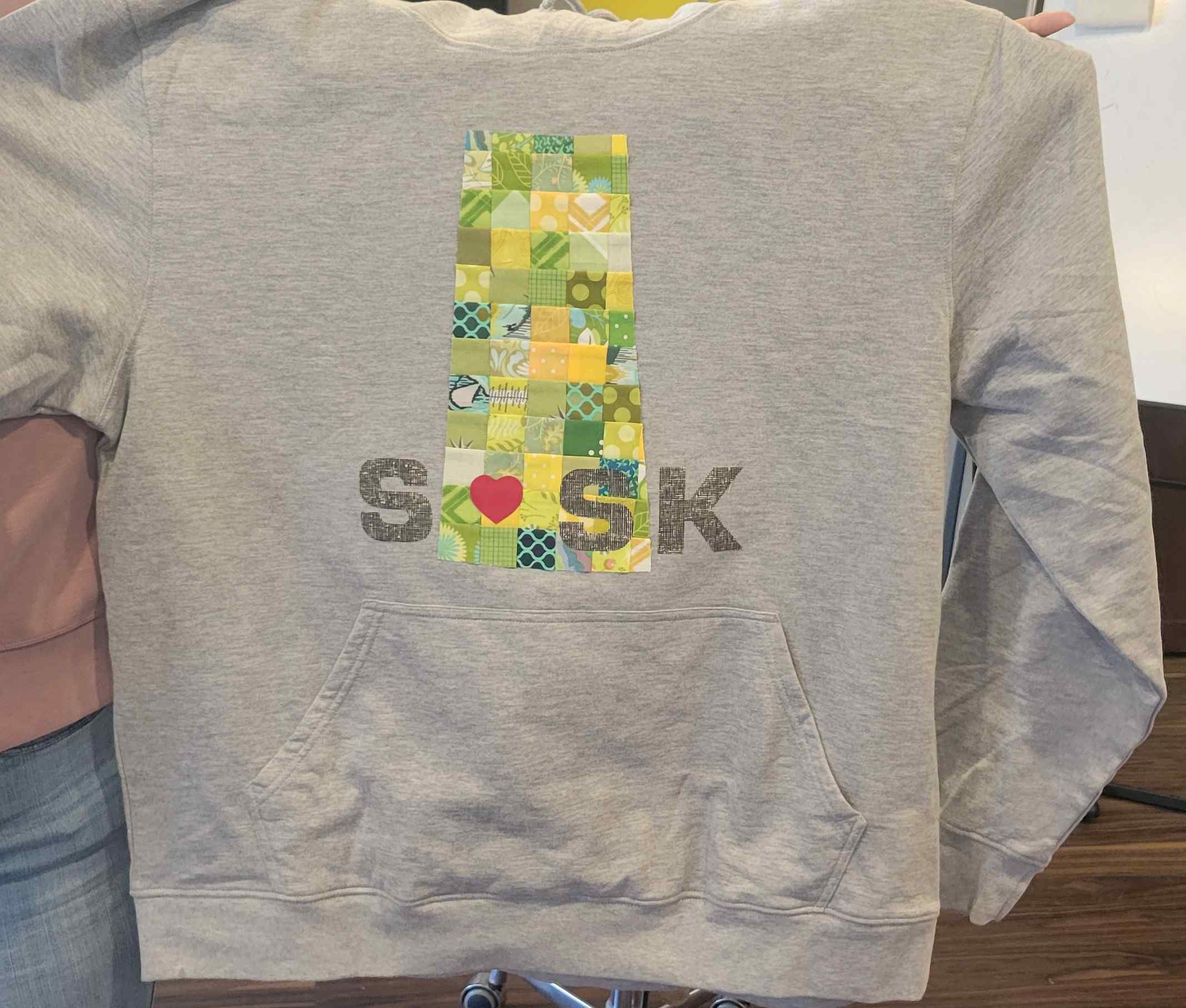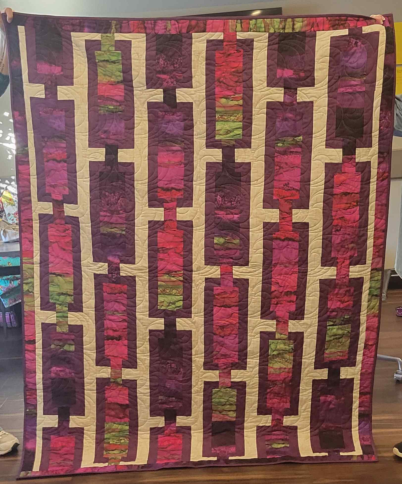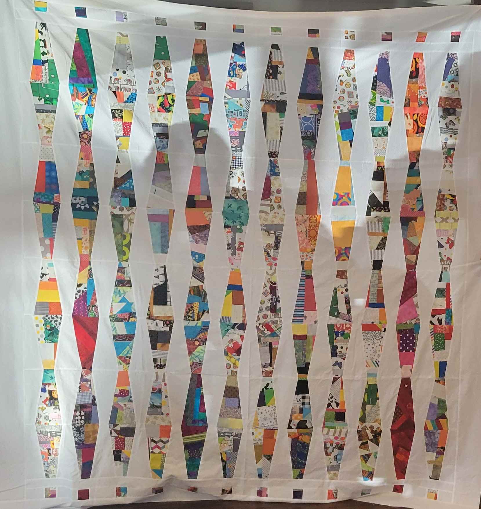 We were inspired by several member projects that sparked ideas for future workshops, including Karen’s sweatshirt, the running shoes, and Dyanne’s beautiful collages. A special thank you to everyone who brought crumb blocks last month, and to Elizabeth for her outstanding work piecing the charity quilt using the Beaded Curtain pattern from Emily Bailey’s Crumb Quilts book. Pat also wowed us with her giant red and white cushion cover made from dreamlines strips. For those of us still working on them, Roxanne will send the following instructions soon.