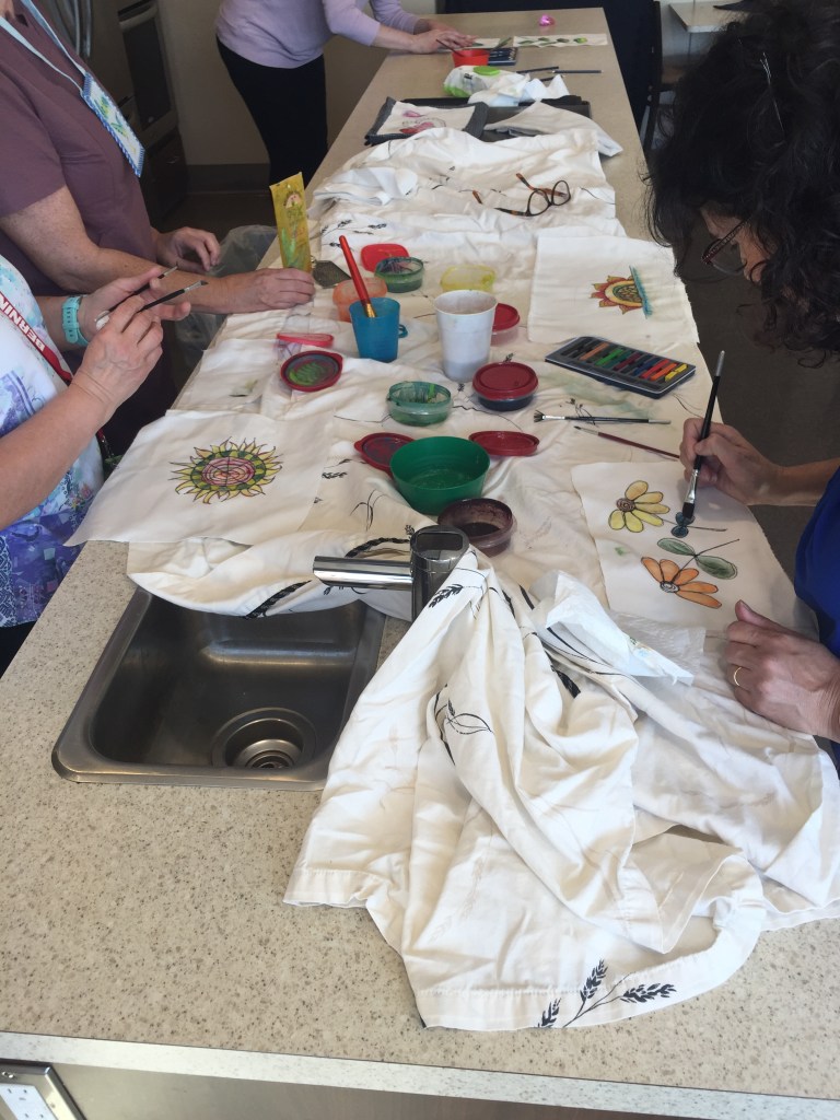 We had an excellent education session with Karen about the use of paint sticks and pencil crayons on fabric. She shared some examples of her work (below) and provided us the opportunity to try fabric painting using different techniques.