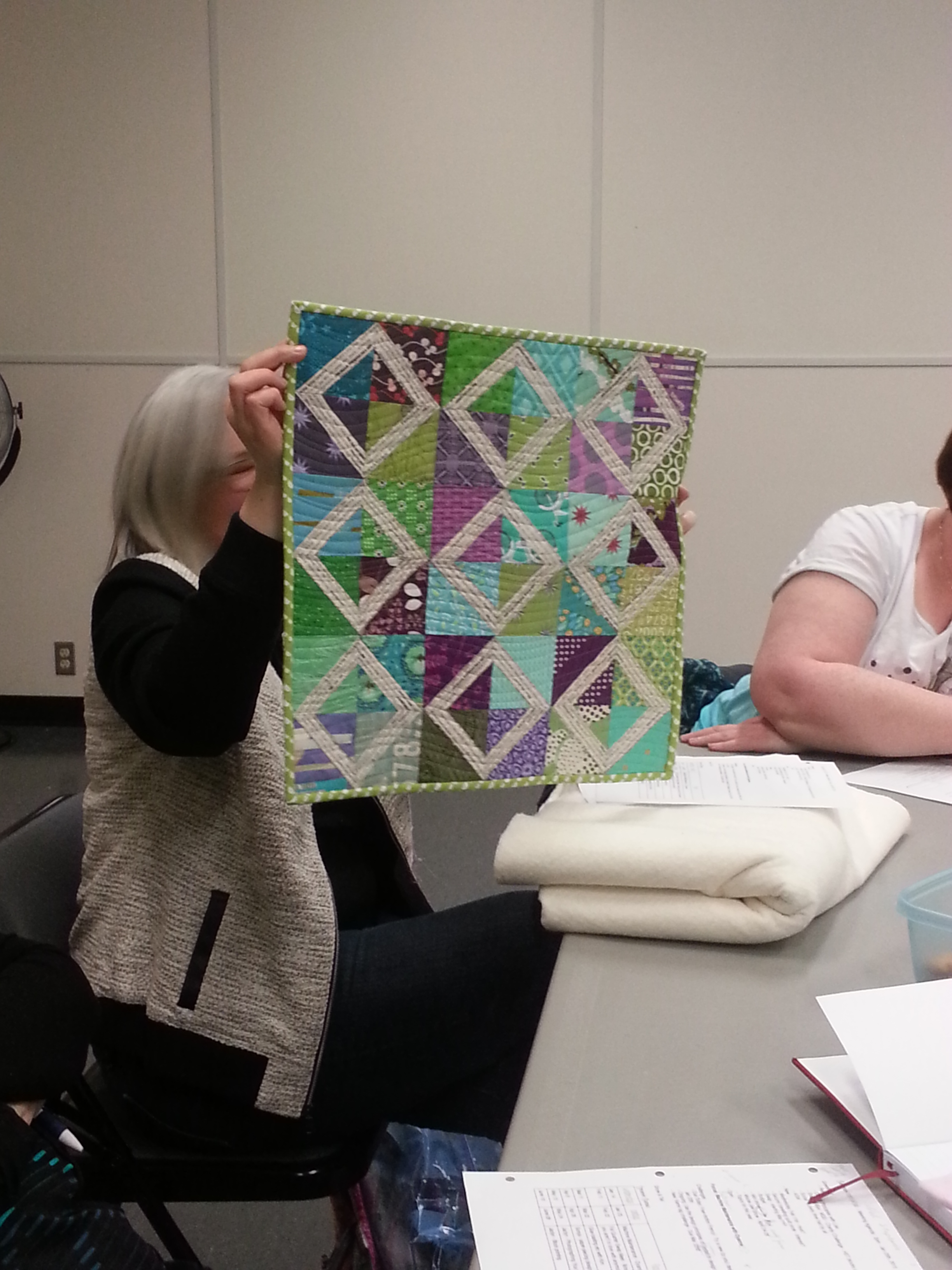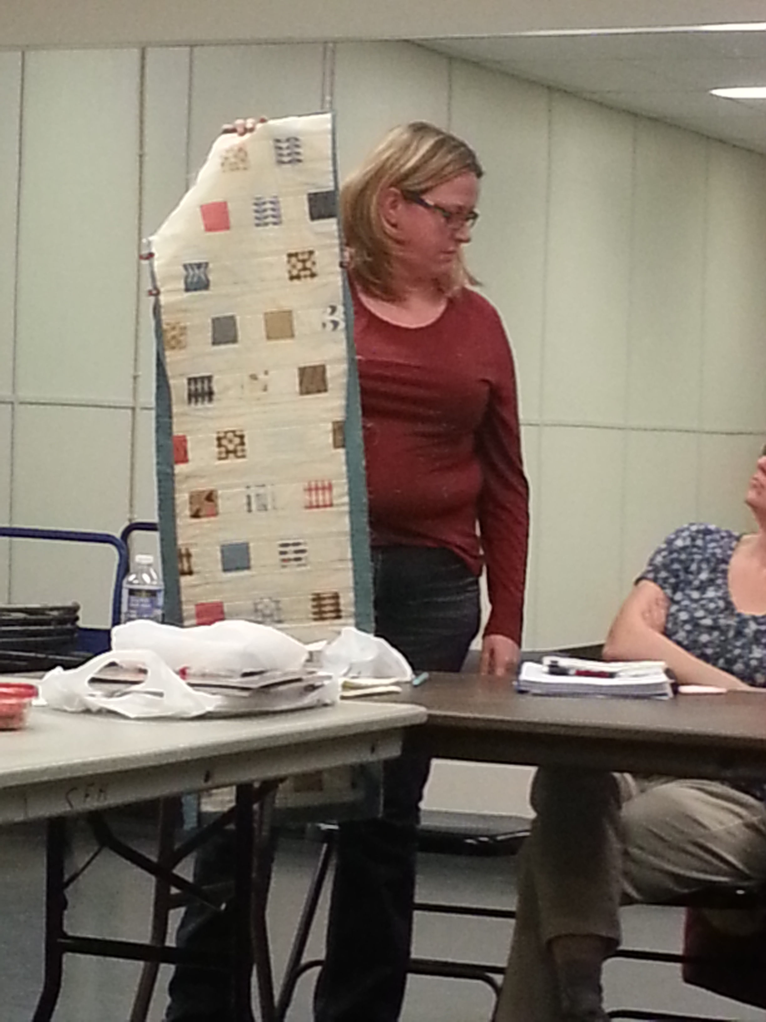 For show and tell, Stephanie showed us her sew together bag, her rainbow mini for a rainbow mini swap a few of us are in, and a baby quilt she is working on.