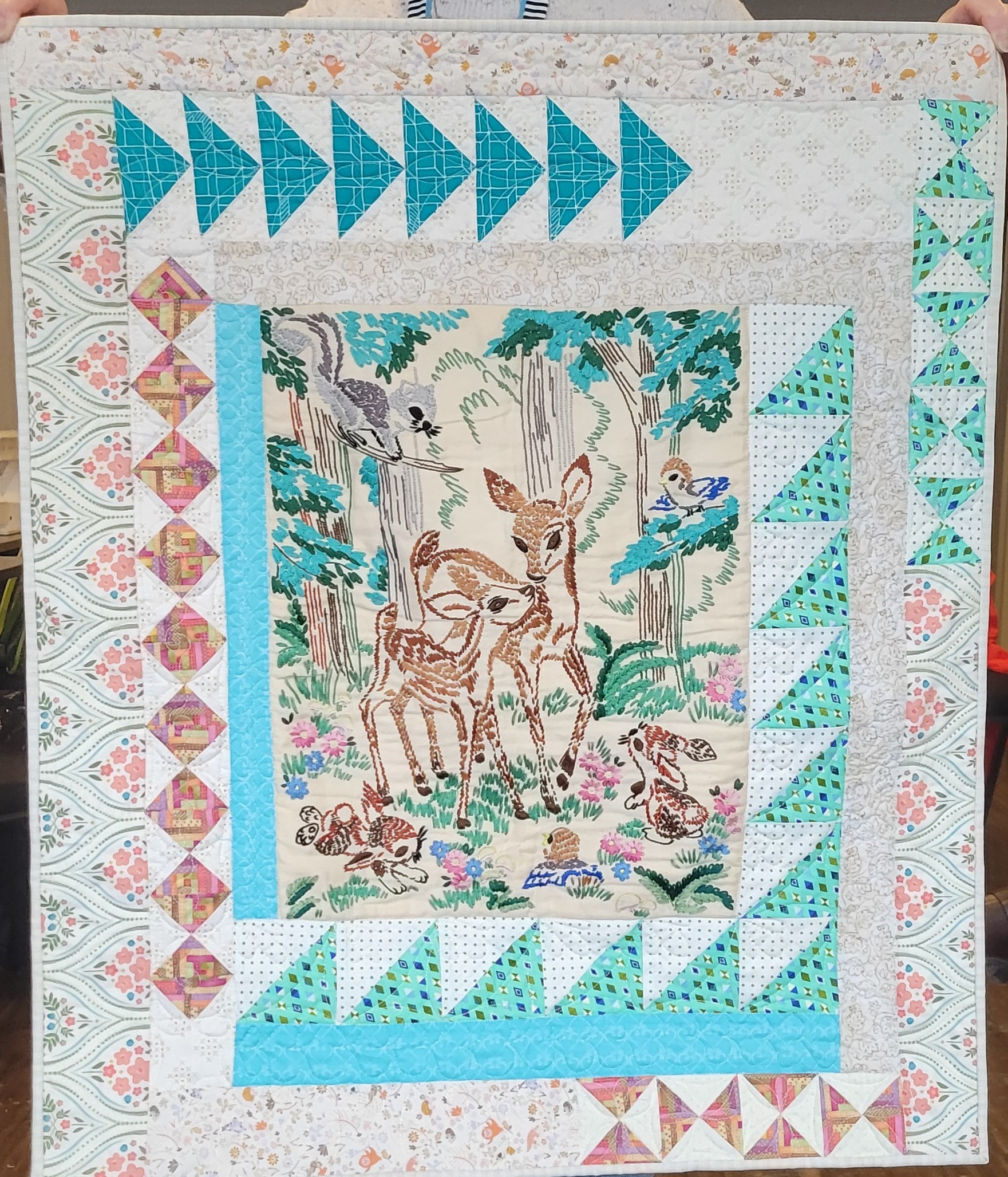 A big thank you to Patty and Roxanne for their fantastic inset circles demo! A few tips to remember are that the circles should be cut 1” bigger than the hole. Iron both the background and circle into quarters to help with alignment. Make the background square a bit oversized so that you can trim the block to the correct size once its complete. It is amazing how perfectly the circle fits into the hole! Fiskars has a Fabric Circle Cutter Kit that works great for cutting the circular shapes.